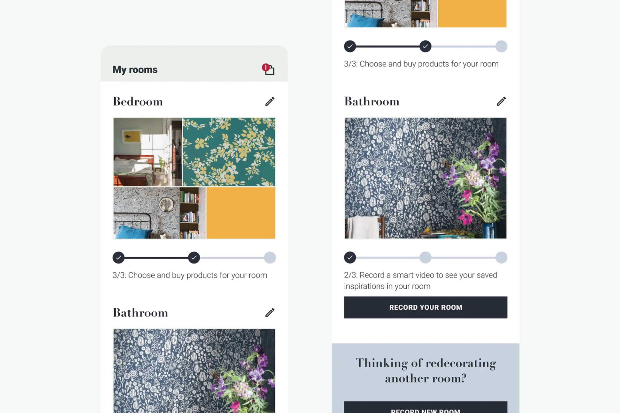 My Rooms – Save room projects at three stages: create project, record room, choose products. Switch between different decoration options for the same room. Supports the natural decision-making process, users want to compare options, not commit immediately.