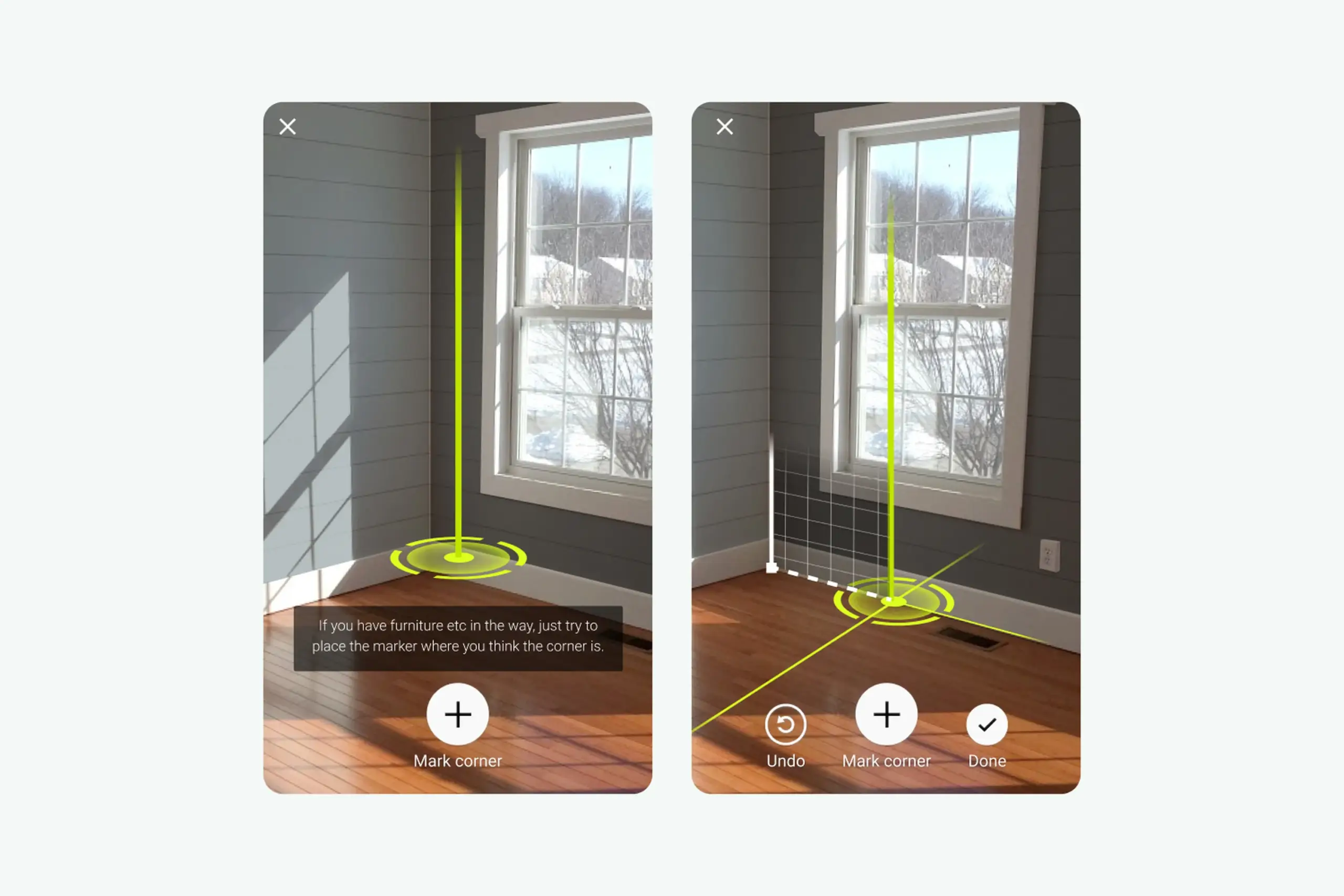 Corner marking interface with green vertical line helping users align with actual wall corners