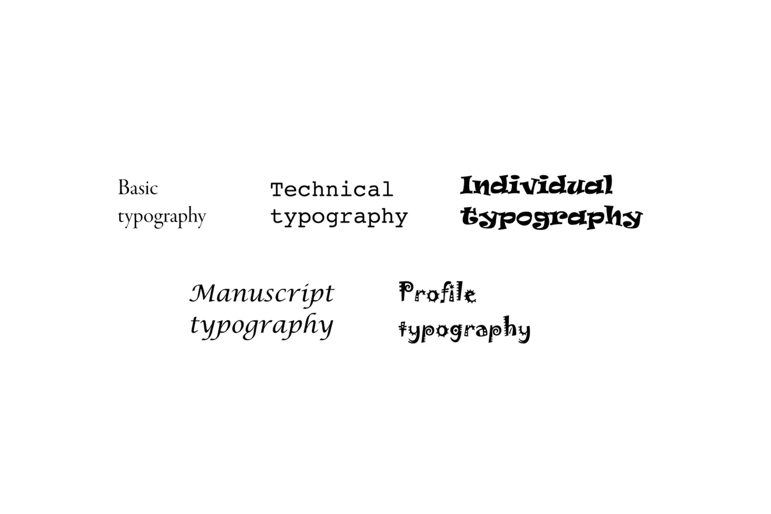 Typography groups representing basic, technical, individual, manuscript, and profile categories