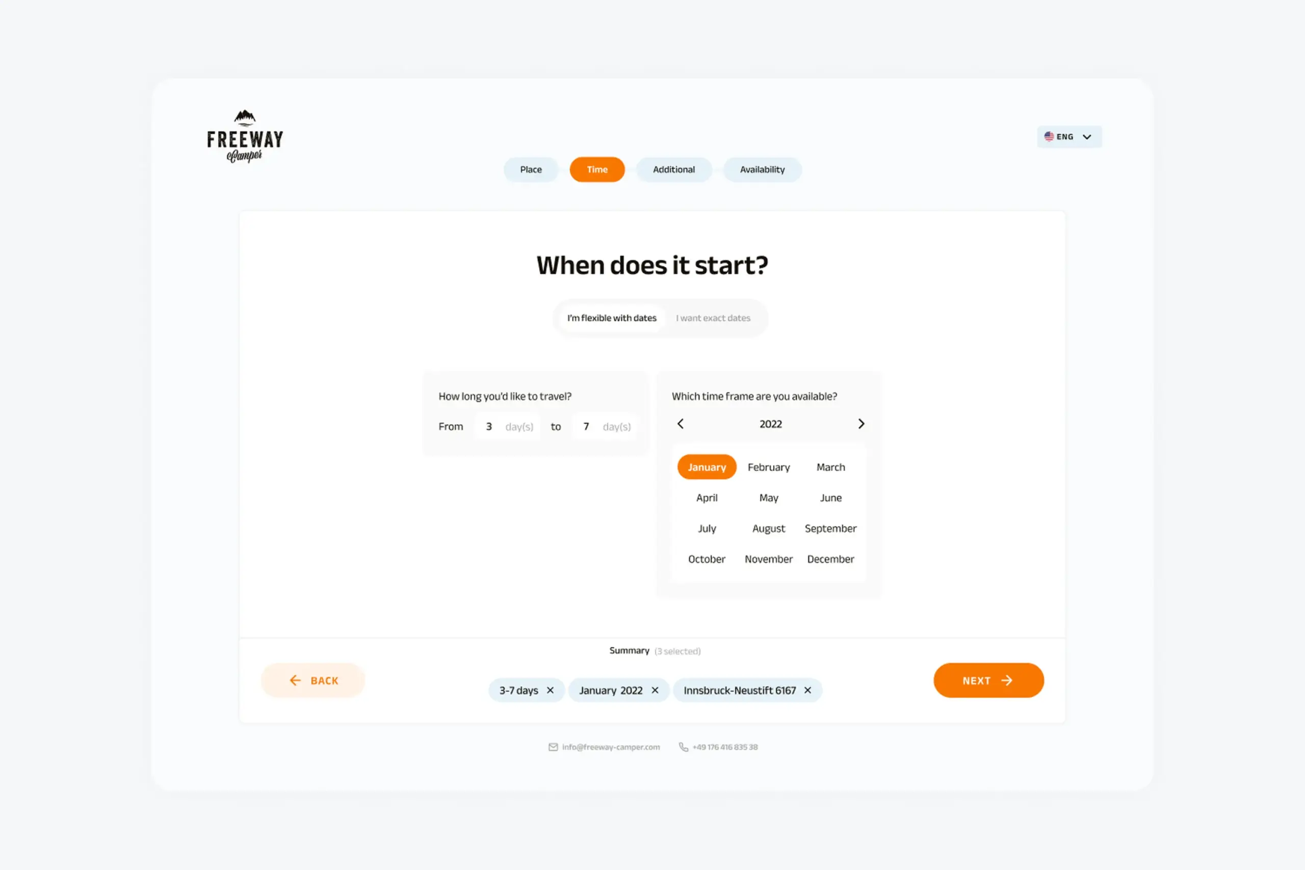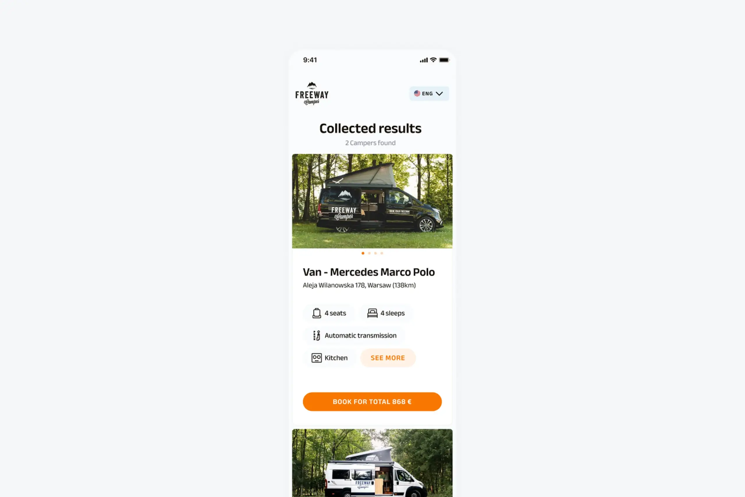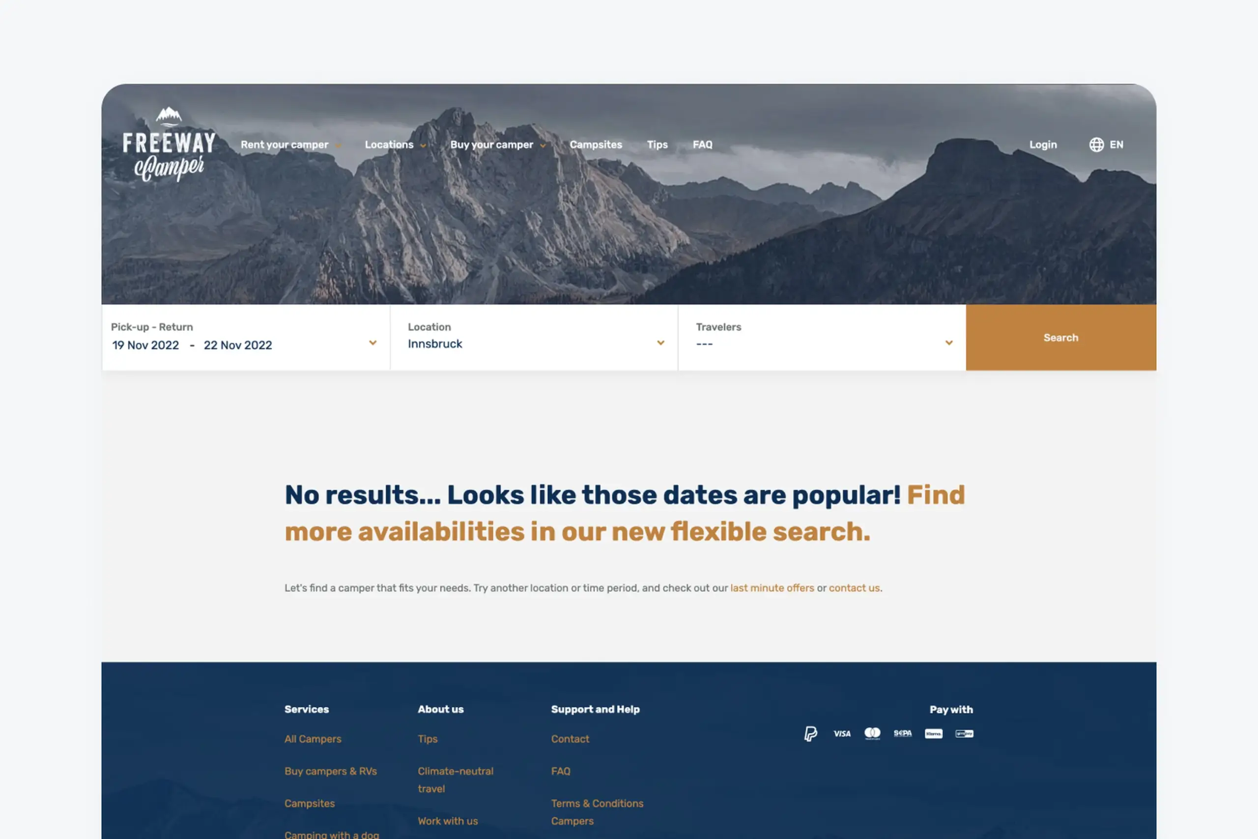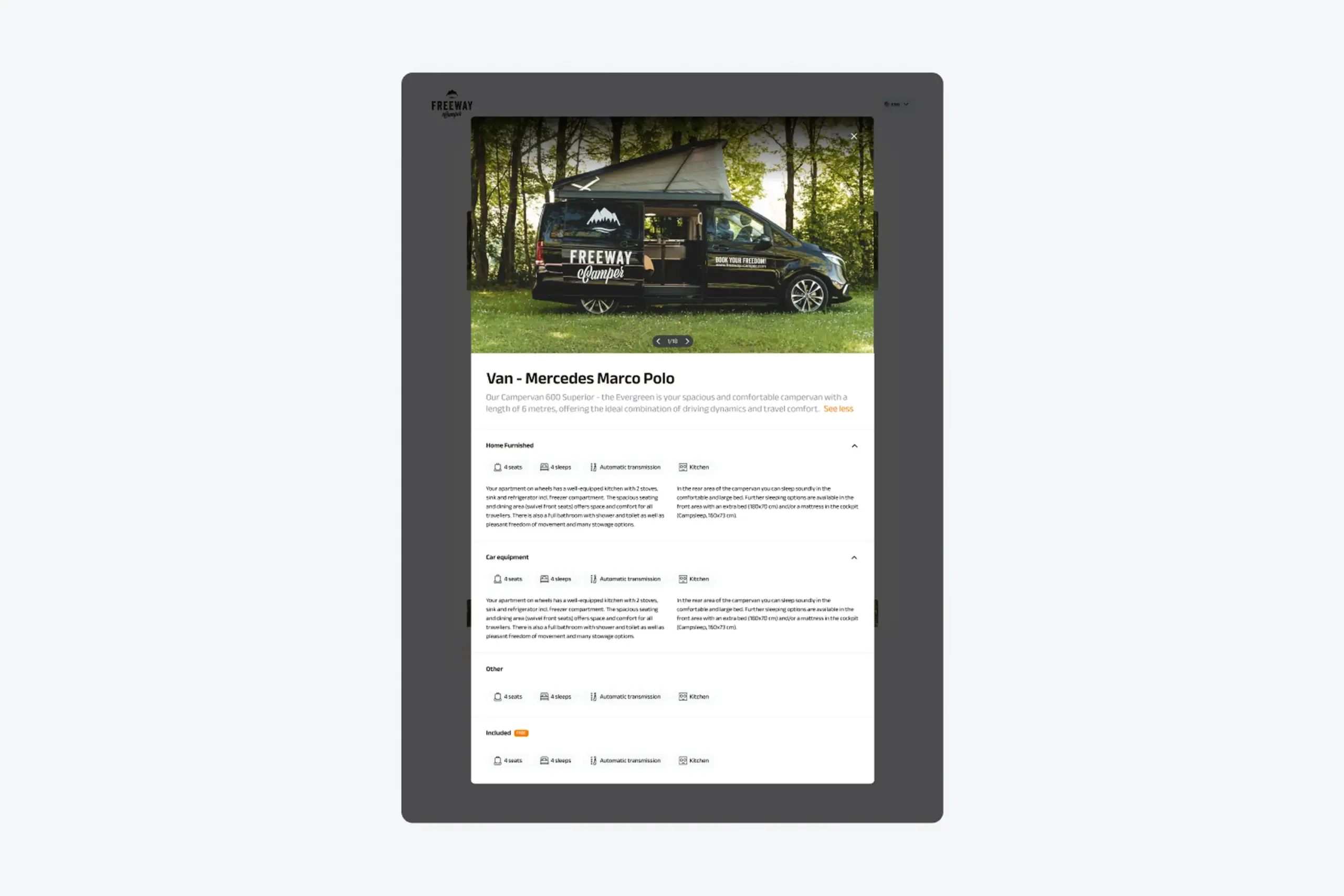 FreewayCamper lets people rent campervans for road trips. The booking flow was straightforward: pick your dates, pick your location, see available campers.