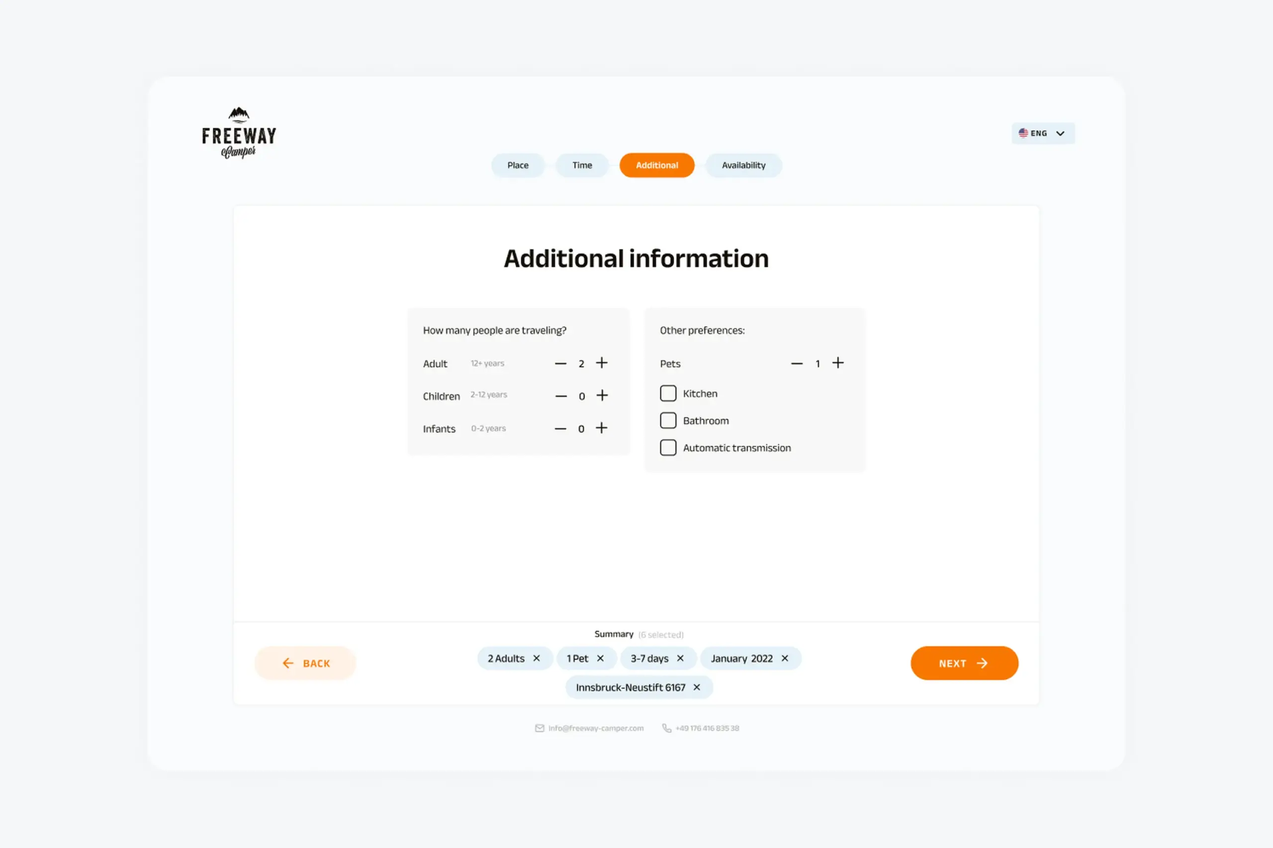 Number of travelers (adults, children, infants). Preferences like pets, kitchen, bathroom, automatic transmission. This step is identical for both flows.
