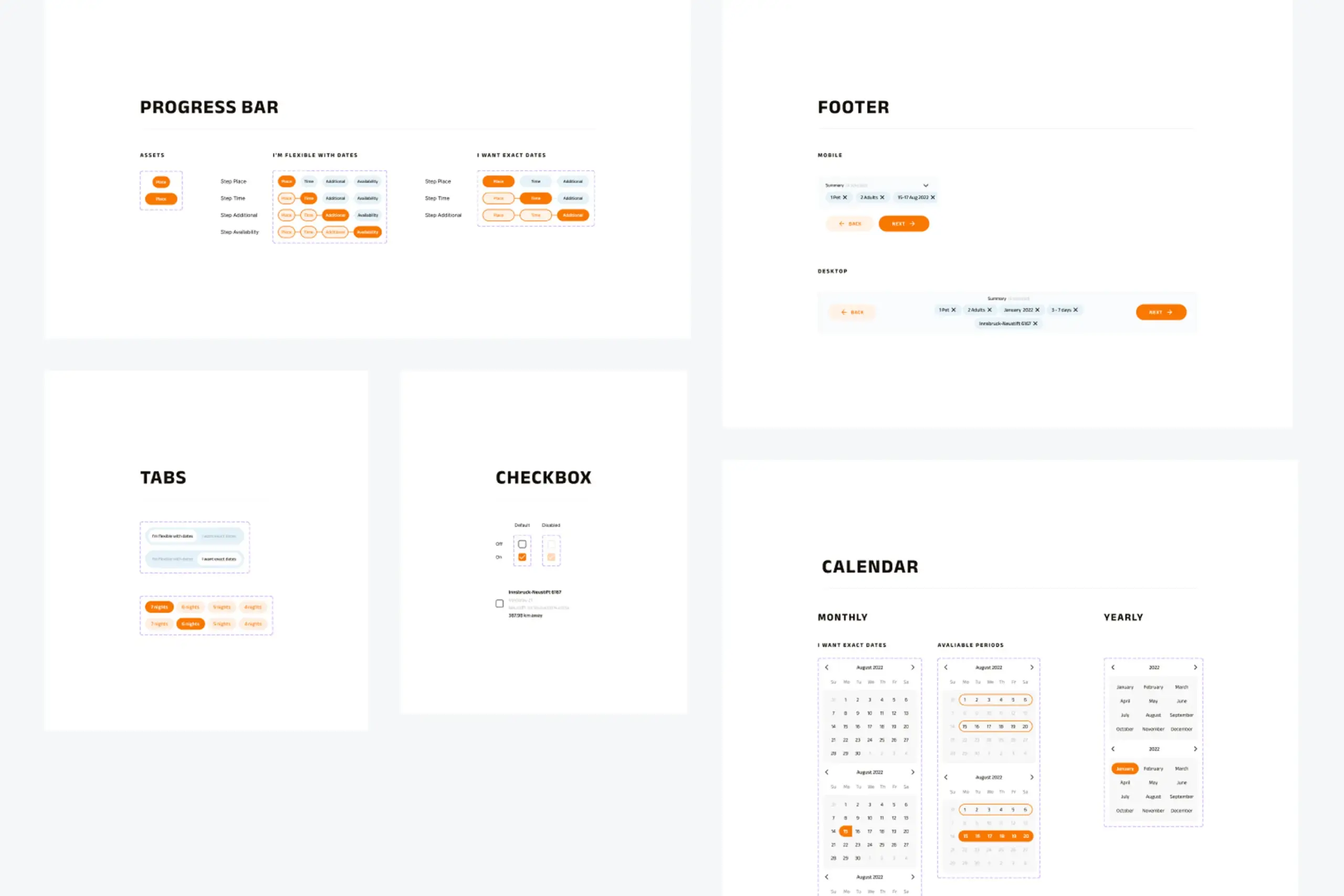 UI patterns for progress indication, navigation tabs, calendars, and footer