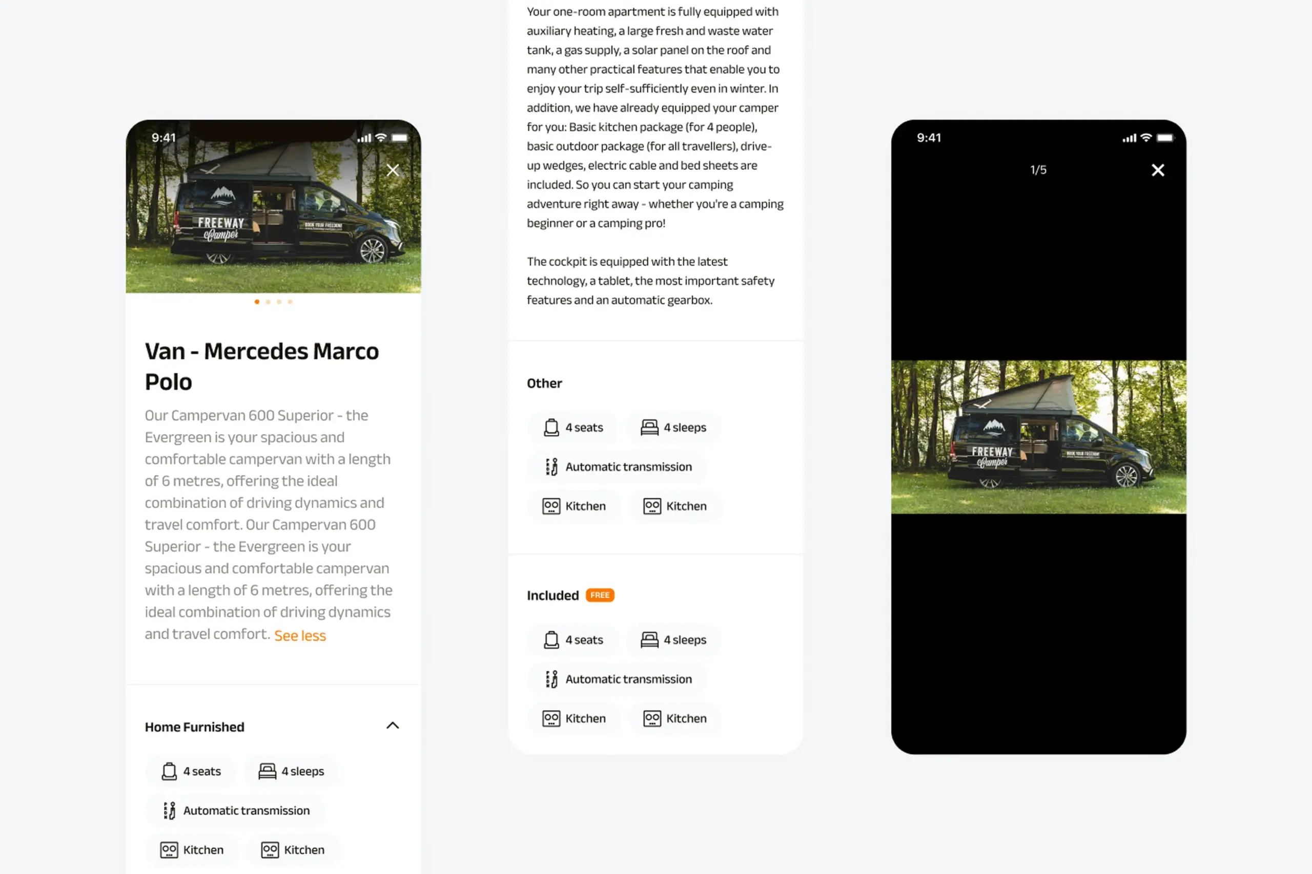 Camper Details – Tapping any camper opens full details: photo gallery, vehicle specs (sleeps, seats, transmission, length), amenities (kitchen, bathroom, etc.), full description, included features and pricing.