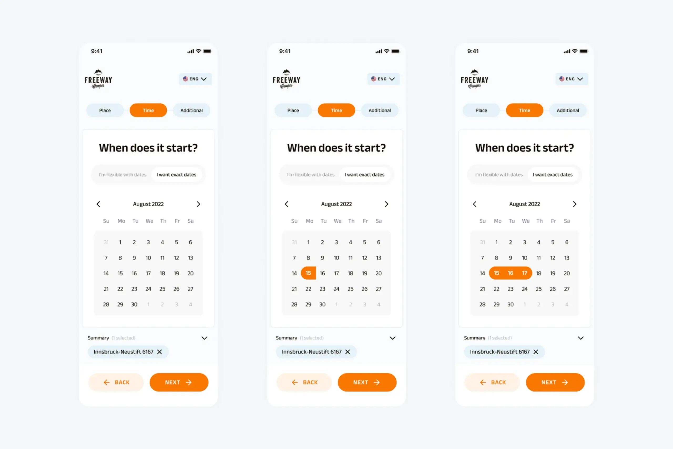 - Exact flow: standard calendar picker for users with specific dates