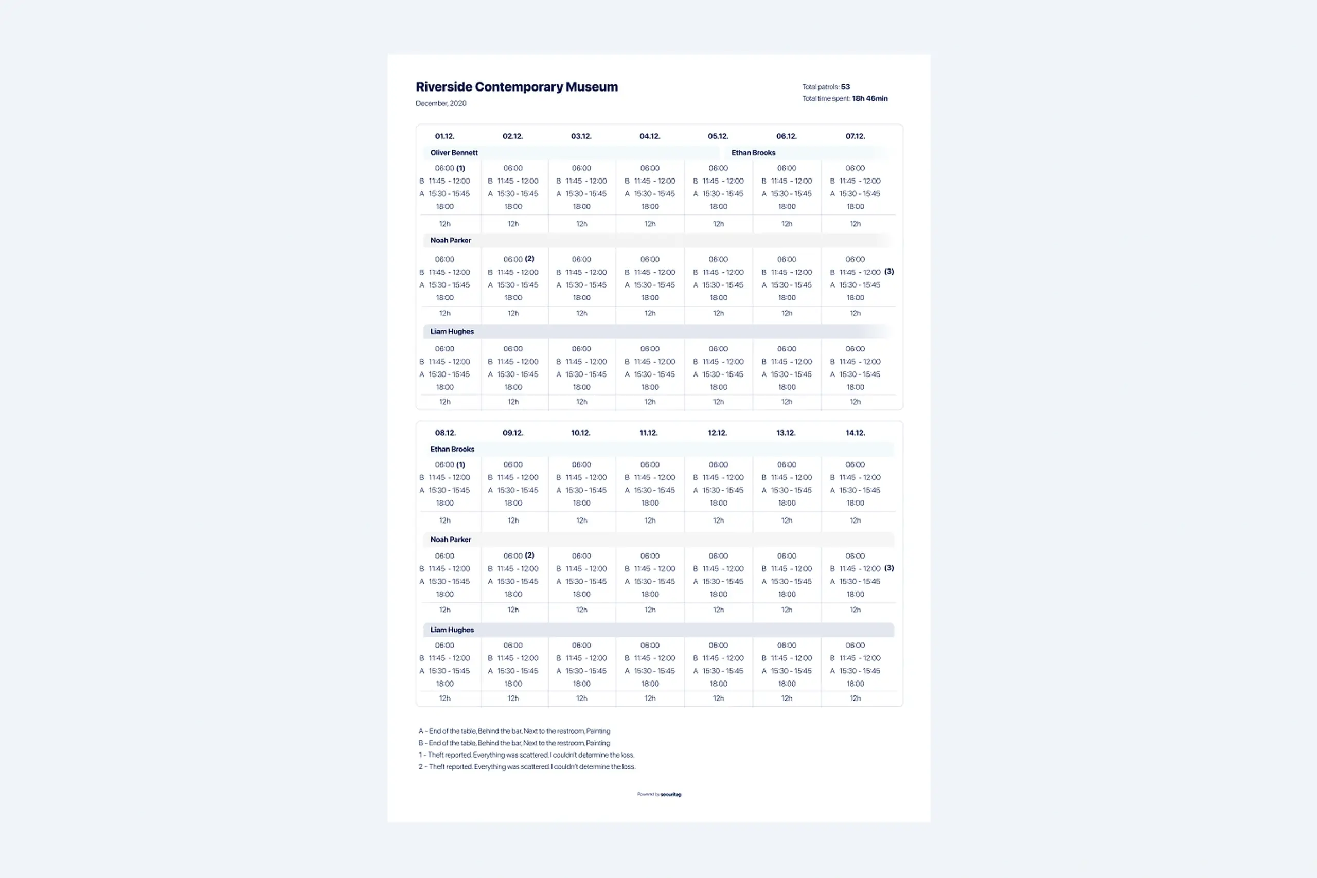 Security guards protect physical locations – warehouses, offices, construction sites, by walking scheduled “tours” through facilities, tapping hidden chips to prove they checked each location. Managers wasted hours daily verifying tours were completed. Guards had developed workarounds to cheat an unreliable system. Schedules lived in Excel spreadsheets with complex hourly rate calculations.