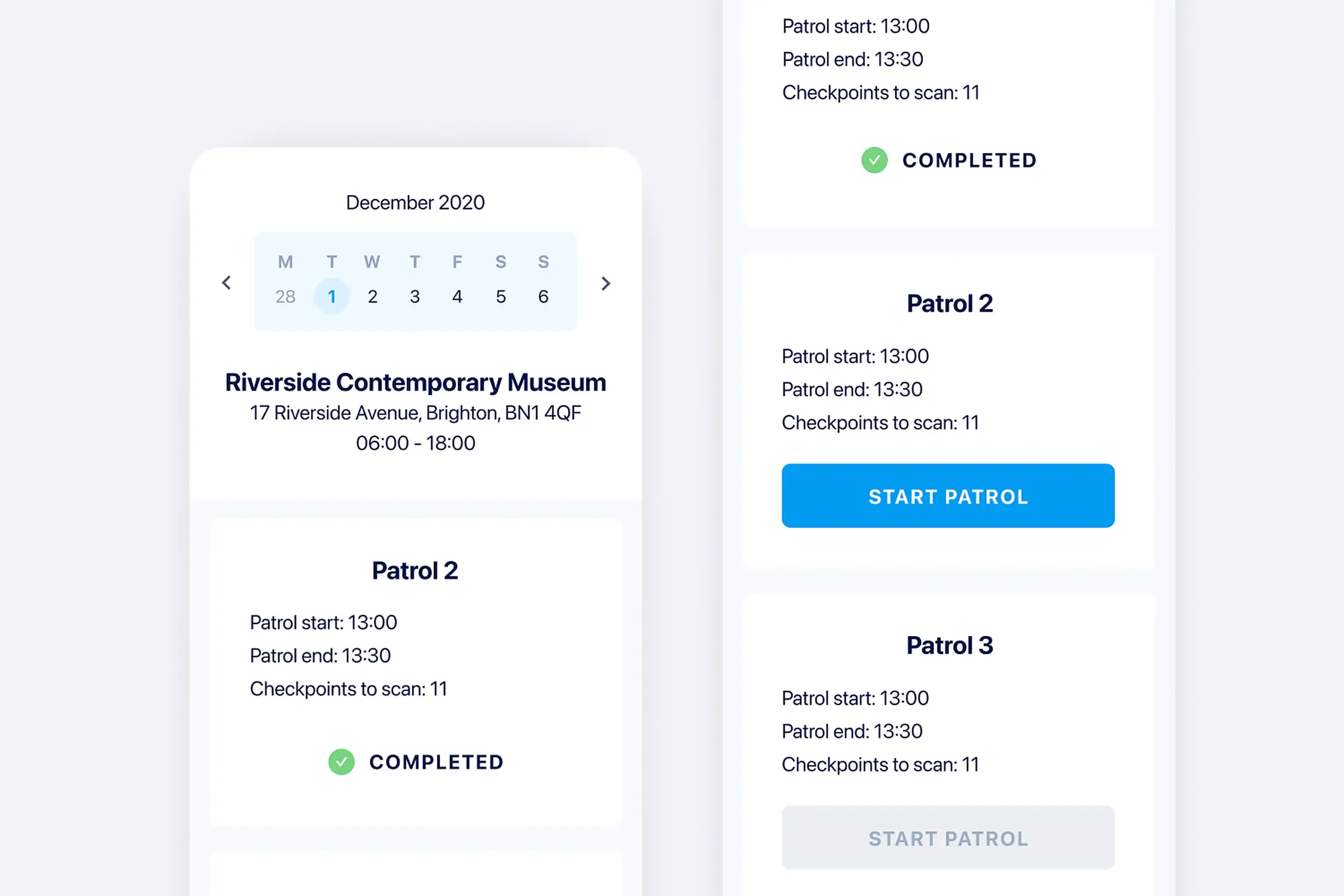 • Two apps for two contexts. Managers at desks need dashboards and scheduling. Guards on patrol need simple checklists and clear feedback. Same system, completely different interfaces.